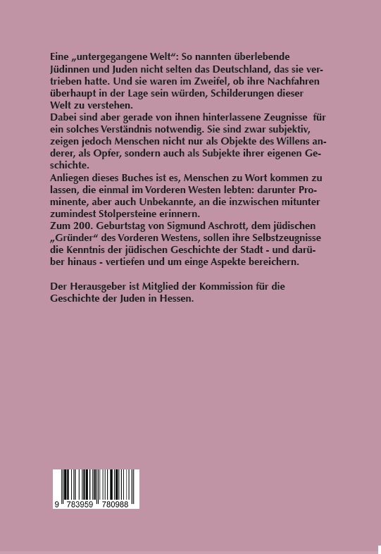 Eine „untergegangene Welt“: So nannten überlebende Jüdinnen und Juden nicht selten das Deutschland, das sie ver-trieben hatte. Und sie waren im Zweifel, ob ihre Nachfahrenüberhaupt in der Lage sein würden, Schilderungen dieserWelt zu verstehen. Dabei sind aber gerade von ihnen hinterlassene Zeugnisse fürein solches Verständnis notwendig. Sie sind zwar subjektiv,zeigen jedoch Menschen nicht nur als Objekte des Willens an-derer, als Opfer, sondern auch als Subjekte ihrer eigenen Ge-schichte. Anliegen dieses Buches ist es, Menschen zu Wort kommen zulassen, die einmal im Vorderen Westen lebten: darunter Pro-minente, aber auch Unbekannte, an die inzwischen mitunterzumindest Stolpersteine erinnern. Zum 200. Geburtstag von Sigmund Aschrott, dem jüdischen„Gründer“ des Vorderen Westens, sollen ihre Selbstzeugnissedie Kenntnis der jüdischen Geschichte der Stadt – und darü-ber hinaus – vertiefen und um einge Aspekte bereichern.